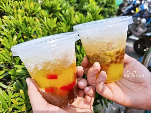 ▲粉圓冰內有一半是滿滿的配料一半是碎冰,在陽光照射下閃閃發光非常好看。