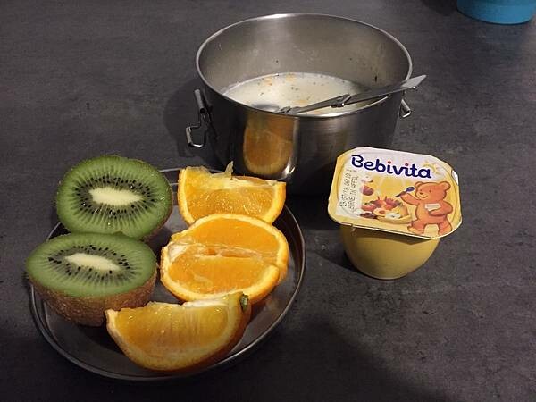 在柏林其中一天的晚餐 : 水果(旅館早餐提供)、自己帶的濃湯包以及超市買的寶寶果泥,營養滿分