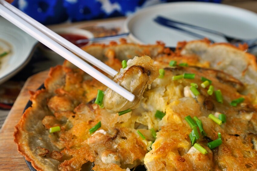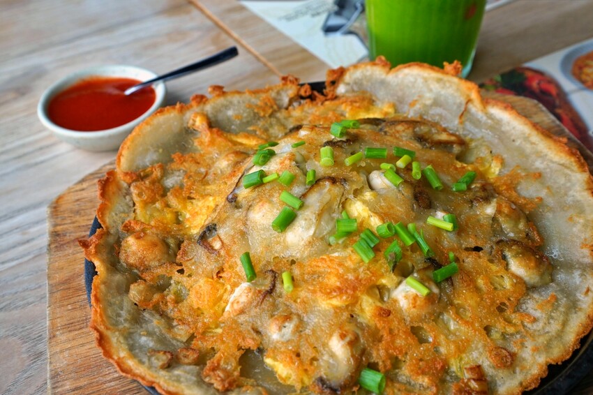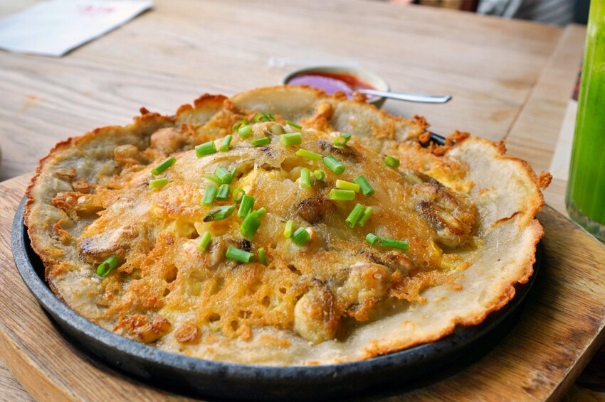 泰式鐵板蚵仔煎搭配的是泰式酸辣醬,泰式蚵仔煎跟台灣蚵仔煎不一樣,沒有加太白粉糊,口感吃起來不會軟軟爛爛的,個人特別喜歡。泰式鐵板蚵仔煎內還加了大量的豆芽菜,雖說是鐵板料理,但是吃起來也不會覺得太油膩,蚵仔大顆飽滿,加上邊邊煎的焦香酥脆的餅皮,非常好吃!