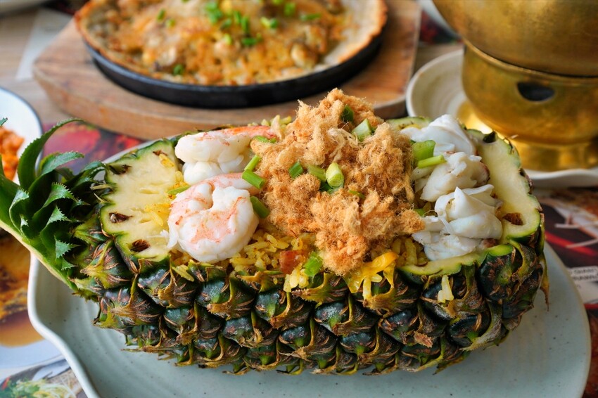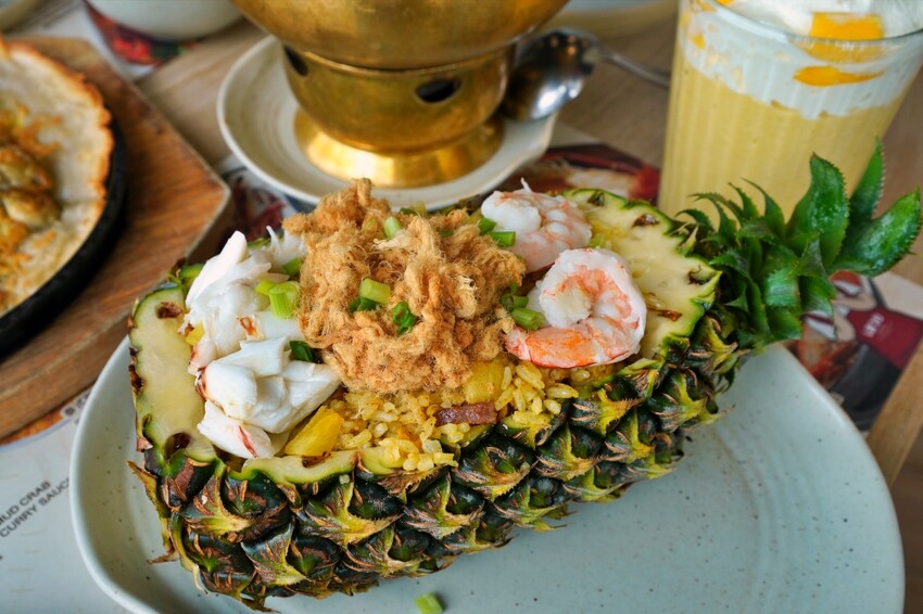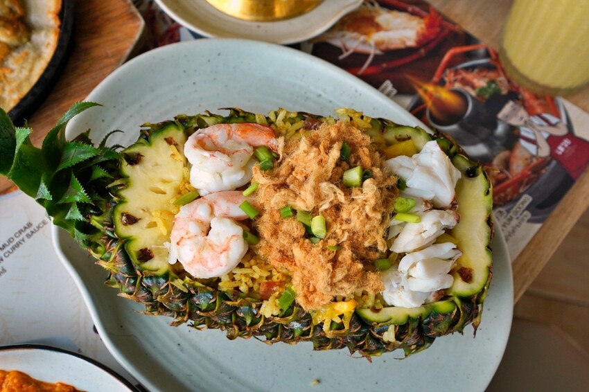 鳳梨直接剖半,加入炒飯以及肉鬆、蝦仁、蟹肉的組合,一端上桌十分霸氣。炒飯單吃起來帶著點淡淡香料味,吃起來非常清爽,可以加上肉鬆一起吃增加香氣,不過最推薦的吃法還是再加點咖哩螃蟹的醬汁,根本無敵。