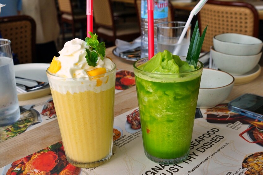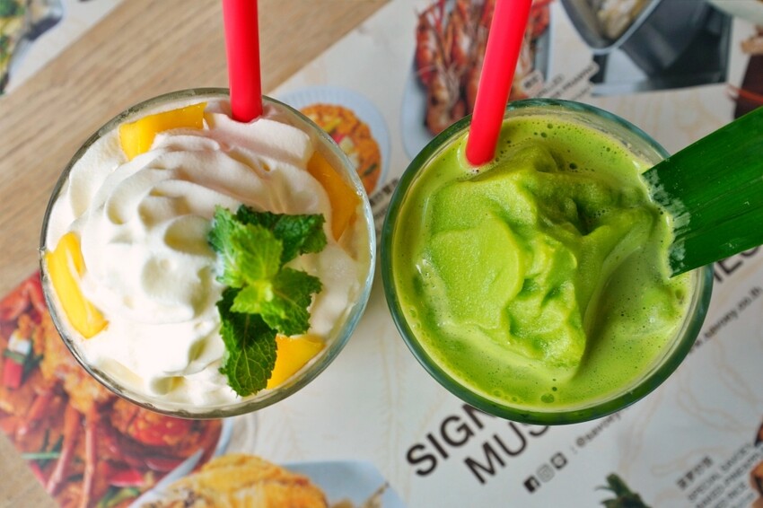 芒果糯米冰沙也太有創意,喝起來就完全就是芒果糯米飯的味道,就是液體芒果糯米飯,這一杯喝下去真的直接飽到天靈蓋!!羽衣甘藍冰沙沒有想像中的菜味,喝起來味道很清爽,還帶點檸檬的酸味,搭配偏重口味的泰國菜十分對味。
