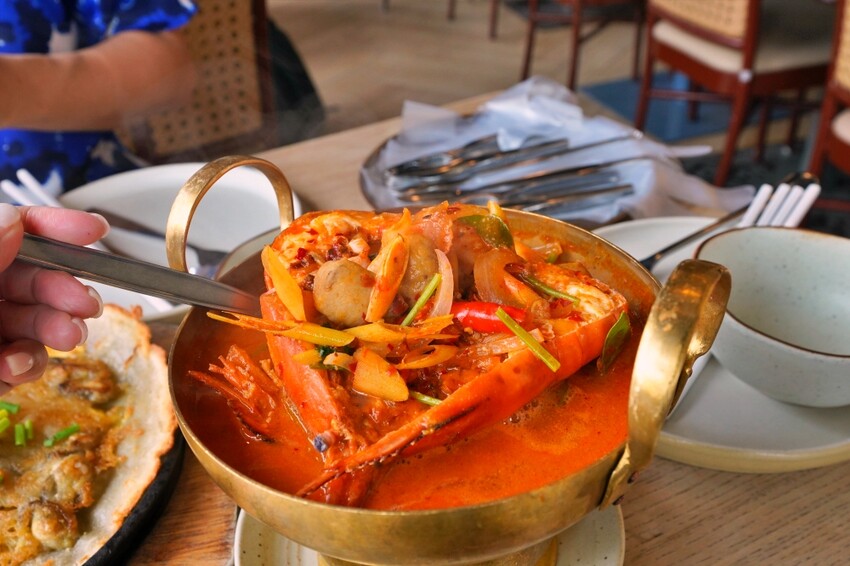 泰式經典的酸辣蝦湯一定要喝!這道冬蔭功蝦湯內的鮮蝦非常大隻,大隻到剖半單吃半隻蝦還是覺得很大隻的地步,酸辣的冬蔭功蝦湯實在是愛得不得了,每次到泰國一定要喝,現在想到這個味道唾液要開始分泌了,喝起來酸辣夠勁非常開胃。