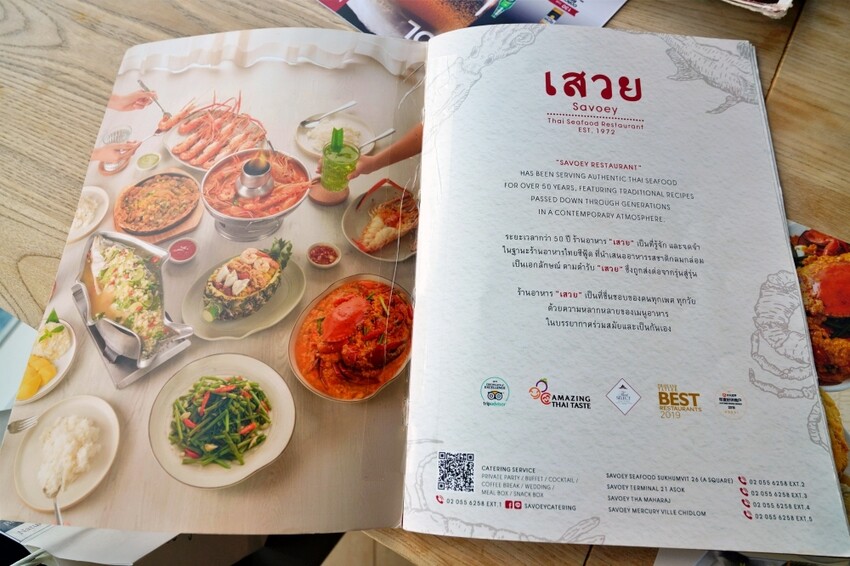 菜單第一頁有著「Savoey上味泰餐館」的介紹,原來是1972年開業至今,已經有五十多年歷史的泰式餐館,餐點口味道地,Terminal 21分店裝潢跟甜點、飲品都非常新穎,位於Terminal 21 百貨五樓,有著大片落地窗,自然採光很好,靠窗的座位可以看到樓下的BTS ASOK站,這次是預約中午十二點來用餐,一剛開始還沒什麼客人,不過吃到一點多店裡已經是客滿狀態還有人在候位,平日生意就非常好,建議可以事先訂位,以免等候太久,Savoey 的官網可以直接填表單預約,網站可以切換中英文介面,預約上很方便。