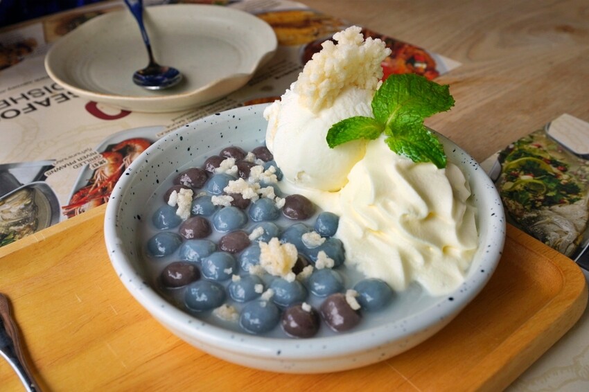 椰子冰淇淋一旁搭配得像粉圓的東西吃起來就像台灣的芋圓,軟Q軟Q的,搭配最上層的酥脆米餅,搭配起來口感層次豐富,泰國的椰子冰淇淋真的太好吃了,每天看到都要吃上一球!