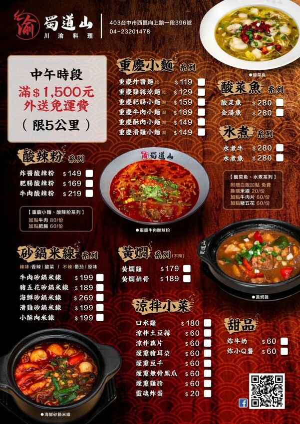這間位在台中西區的蜀道山餐館是今年六月份新開幕的道地川渝料理,老闆娘本身就是重慶人,特別將家鄉味帶來台灣,讓大家在台灣也能吃到美味又道地的道地川渝料理,除了招牌酸菜魚,還有水煮系列、重慶小麵及酸辣粉,內用享白飯免費續