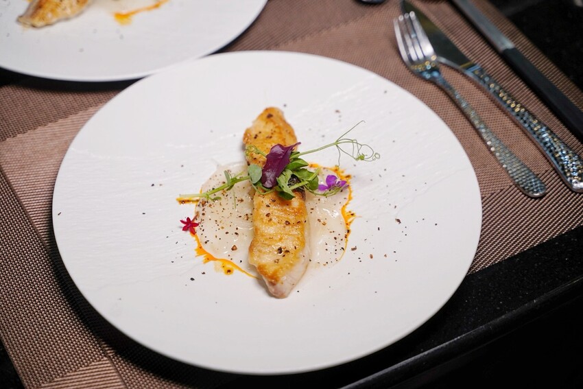 「時令鮮魚」當天吃到的是香煎鬼頭刀,以干貝洋蔥醬鋪底,接著淋上椒麻辣油,再放上煎好的鬼頭刀,最後以食用花點綴,鬼頭刀口感鮮嫩,有點像雞肉口感,洋蔥醬帶出甜味,椒麻辣油則帶有川味,整個很有層次感。