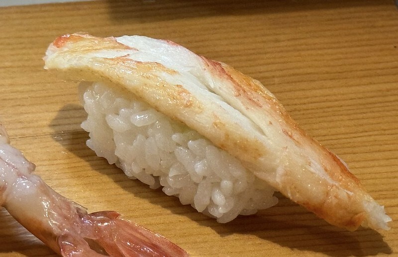 牡丹蝦是我最愛的微黏口,佐上一點點哇沙米帶味,那微嗆辣後的蝦肉甜反襲,一整個飽嘴鮮,滿足到不行,突然發現這一貫的醋飯也帶了一點點微黏,甚至是微溫。是那種我偏好,不太有存在感的醋飯,即便飯量不少。