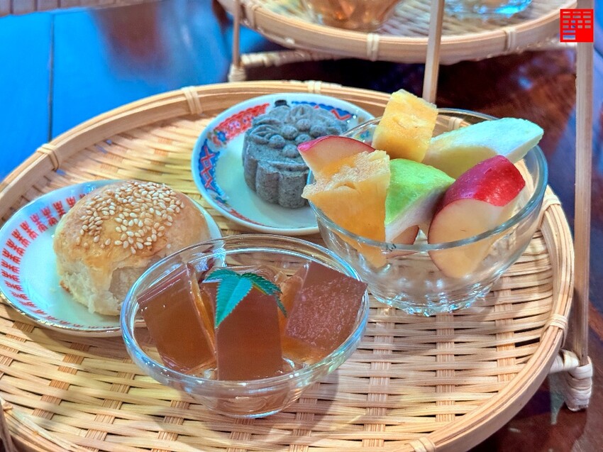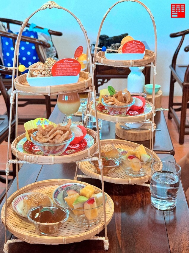 茶點會從餞龕糕、麻荖、小口酥餅、蜜地瓜、古早味餅仔、咖啡凍、桂花凍、古早味冬瓜凍、蘿蔔絲餅、肉燒餅、麻糬、蜜餞果乾、蒸菱角、古早味小蛋糕等茶點中選7種,放在三層架上,好看又好拍。
