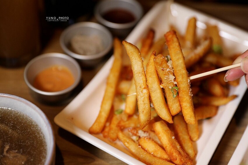 脆薯粗細適中 金黃的色澤和誘人的香氣讓人垂涎 拌入蒜碎、蔥花 並搭配主廚特調的香料粉