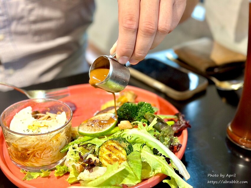 沙拉的部份醬汁也可以選擇,我跟老公都選擇胡麻醬,他們家的生菜沙拉也挺好吃,很多款生菜在裡面,還搭配烤櫛瓜、花椰菜等。