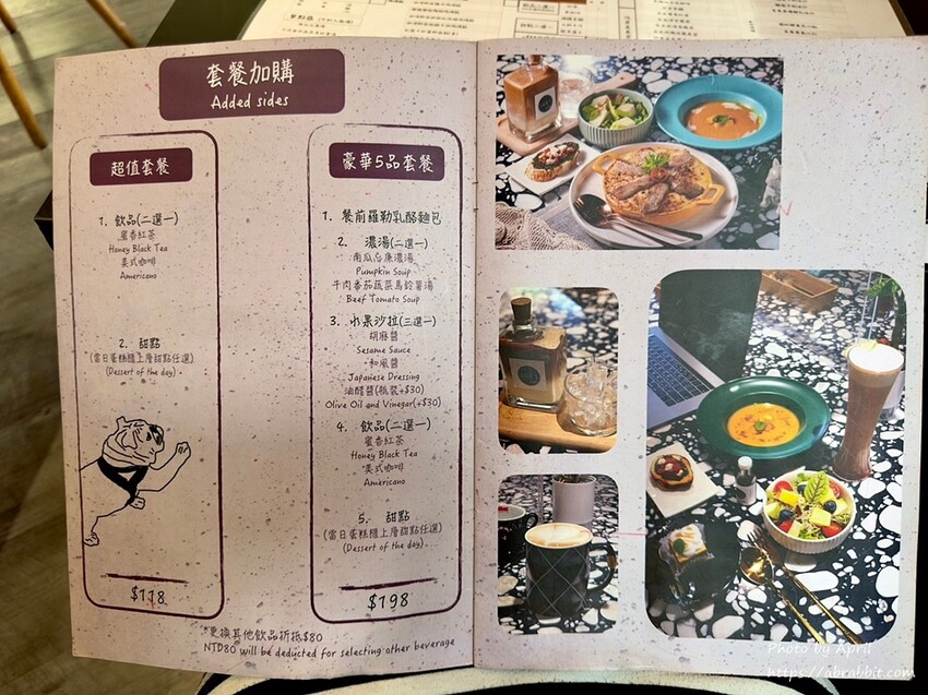 店內賣的餐點非常多款式,有義大利麵、焗烤飯、咖哩飯、溫沙拉、早午餐、甜點與飲品、下午茶等,低消是一份套餐。