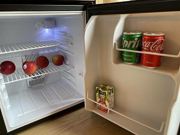 還有個書桌有Nespresso 膠囊咖啡機、、抽屜打開也可見馬克杯、膠囊咖啡球、奶精球、砂糖、飲用水、熱水壺、茶包、削水果刀、魚飼料~冰箱