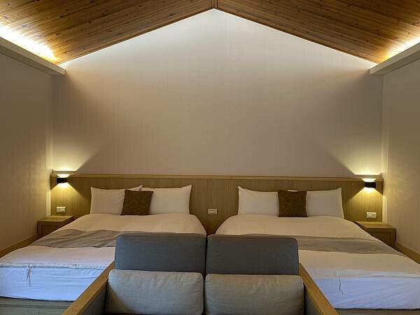 兩張雙人床、小小的床頭櫃配上床頭燈簡約卻又不失美感