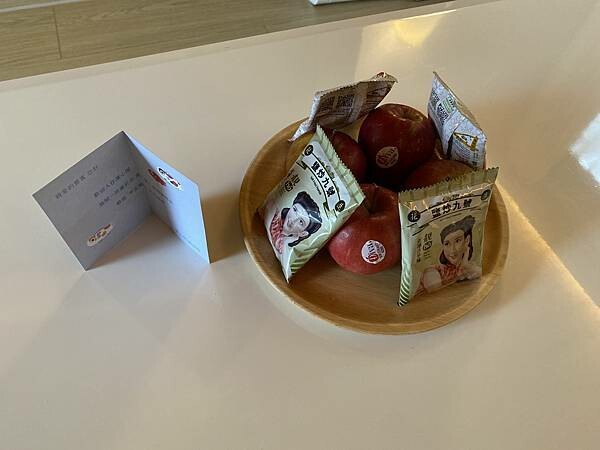 前方有個小沙發、茶几,桌面上還有迎賓的四顆蘋果、和小餅乾