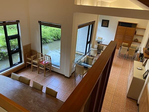 有兩層樓的位置木白色系搭,簡約大方,大大的窗戶看著綠植享受早餐