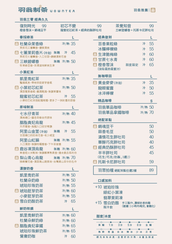 羽翁制茶原本是台中潭子人氣茶館,後來轉型成質感手搖飲店,主打新鮮現泡茶,還保留了茶館的人氣飲品及經典茶點
