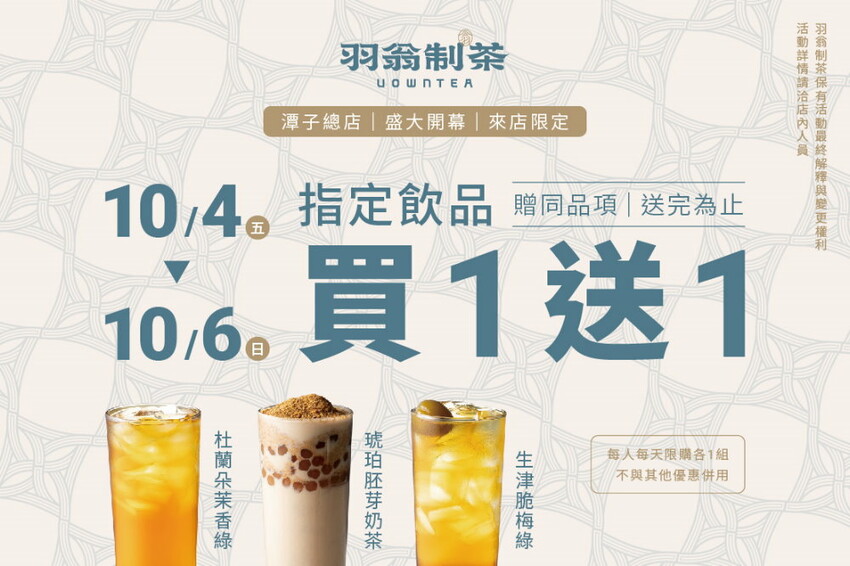 羽翁制茶慶開幕,於10/4-10/6連續三天,購買指定飲品享買一送一,每人每天限購一組,不與其他優惠併用