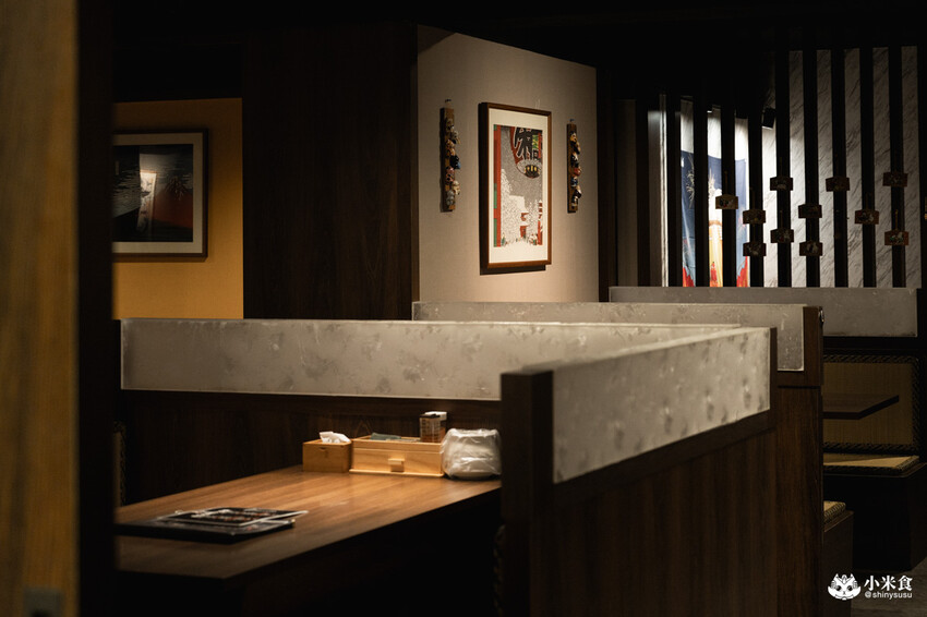 一樓除了雙人小吧檯座位,有張溫馨的小長桌,其餘空間是師父們的料理工作區;二樓為主要用餐空間,環境寬敞、間距舒適,座位以四人位為主,也有提供八人位與一間圓桌包廂;