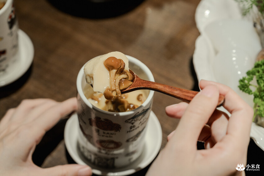 看似平凡的滑菇茶碗蒸,卻是不可或缺的美味配角,滑嫩的黃金色蒸裡,滿藏著菌菇的鮮美精華,這碗茶碗蒸,暖心加乘了整套料理的美味層次