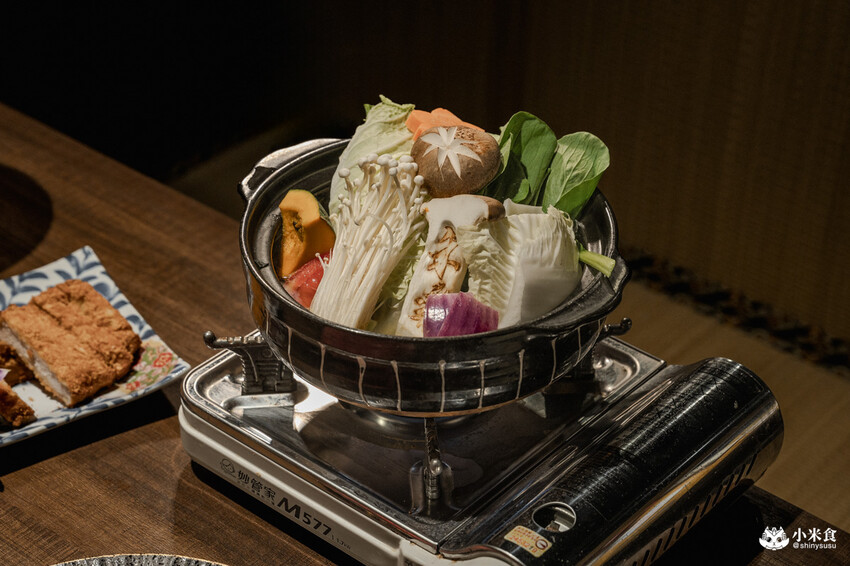 除了豐盛的鍋物套餐,也有提供充滿家溫度的午間定食,隨人喜愛自由選,定食以托盤盛裝,提供基本蔬菜沙拉、滑菇茶碗蒸、三款小菜、白飯與味噌湯,