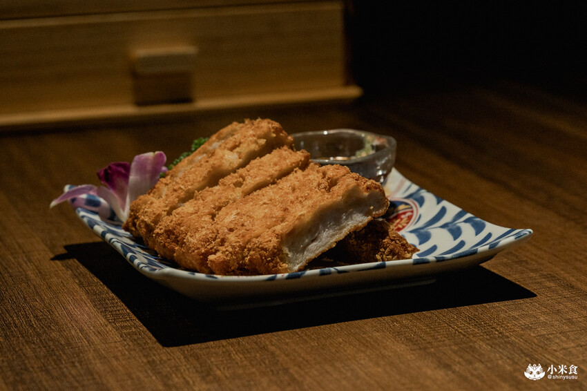 本次刺身提供鮭魚、旗魚和紋甲花枝捲,最愛這塊入口即化,有著豐腴油脂的橘色寶石,魚肉嫩粉透白的為旗魚,入口綿密嫩軟,搭佐上芥末、醬油與些許禾樂特調水果醋,清爽又甘甜