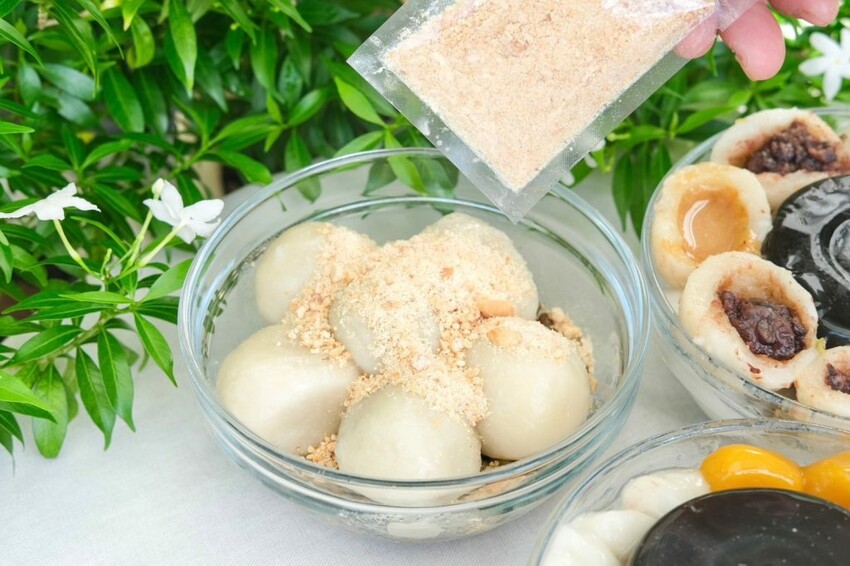 ▼現在購買6或8粒湯圓,會附贈一包桂花釀或花生粉擇一,直接變成古早味花生燒麻糬和古早桂花甜湯!