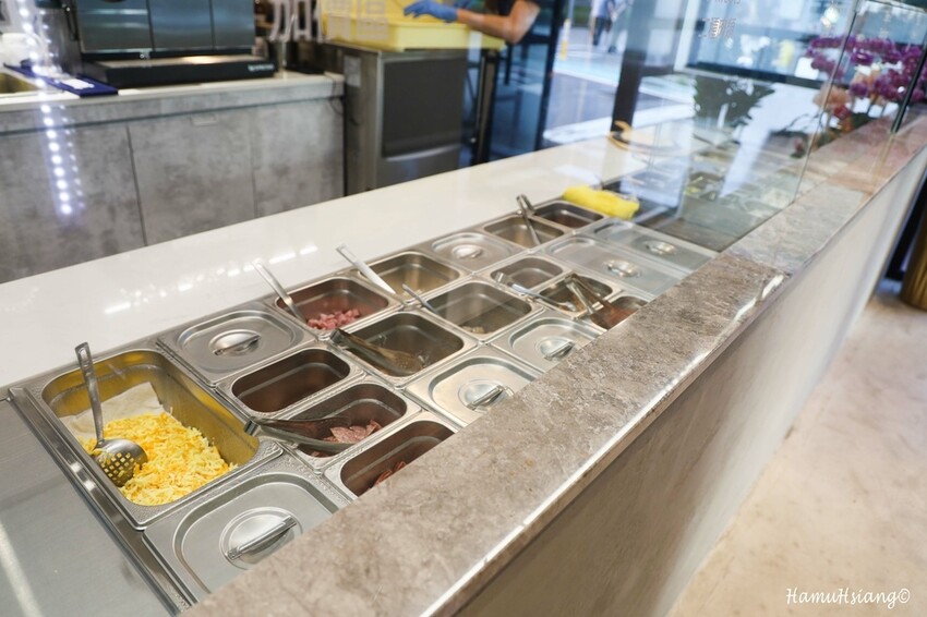 先選你要的醬料,搭上起司與你要的三種菜+2種肉