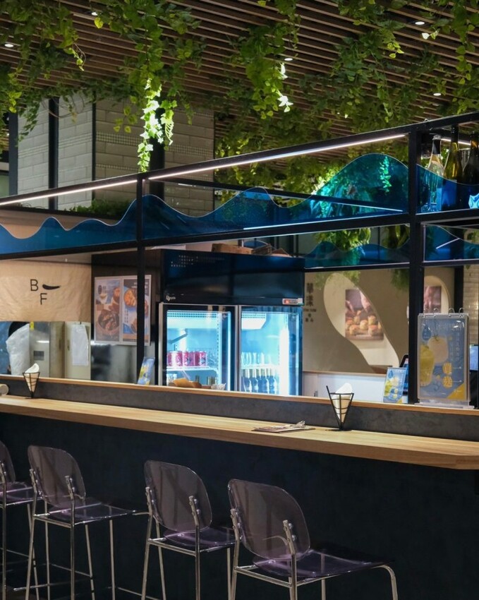 ▼【BLUE FISH BAR】是安永集團的輕食新品牌,位於NOKE忠泰樂生活商場五樓,附有地下停車場,大眾交通工具可坐至捷運「劍南路站」步行約5分鐘,以藍色調的海洋風格為設計,結合獨特的火車車廂造型與日式暖簾,打造出充滿都市叢林的悠閒空間。