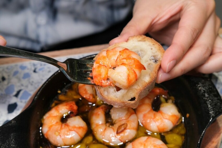 ▼西班牙料理中經典的蒜味蝦,使用野放生態根島蝦以橄欖油煎煮,再撒上大蒜與乾辣椒香氣十足,附上了長棍麵包可以沾著醬汁一起吃~