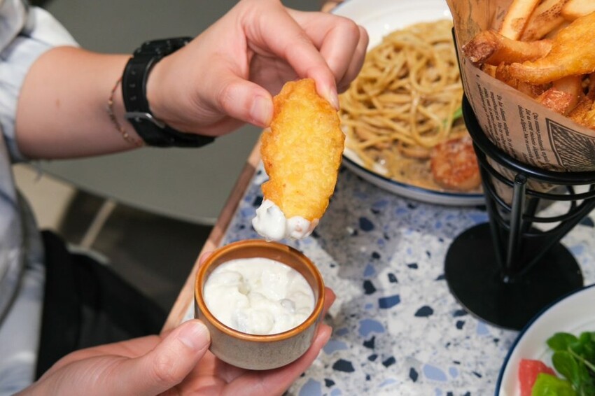 ▼加入官方 Line好友贈送的炸魚薯條,炸衣外皮酥脆不油膩,保留鱸魚鮮味及肉汁,推薦要沾上主廚手工特製的塔塔醬,微酸的滋味超討喜解膩,更能帶出魚肉的甜味。