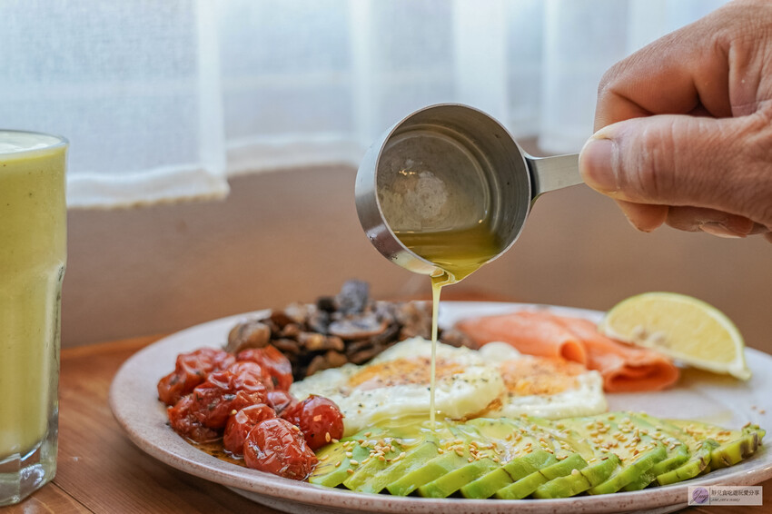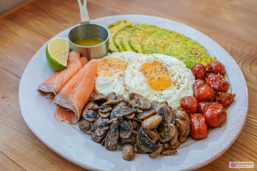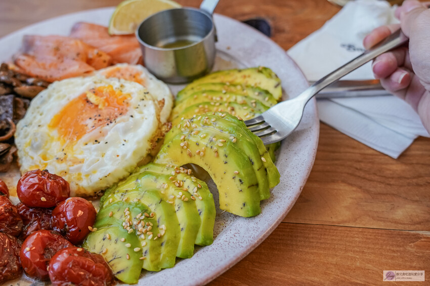 我點了煙燻鮭魚、酪梨、檸檬油醋、太陽蛋兩顆、炒蘑菇和香料烤蕃茄,整個擺盤超級豐盛,真的是吃得心滿意足。