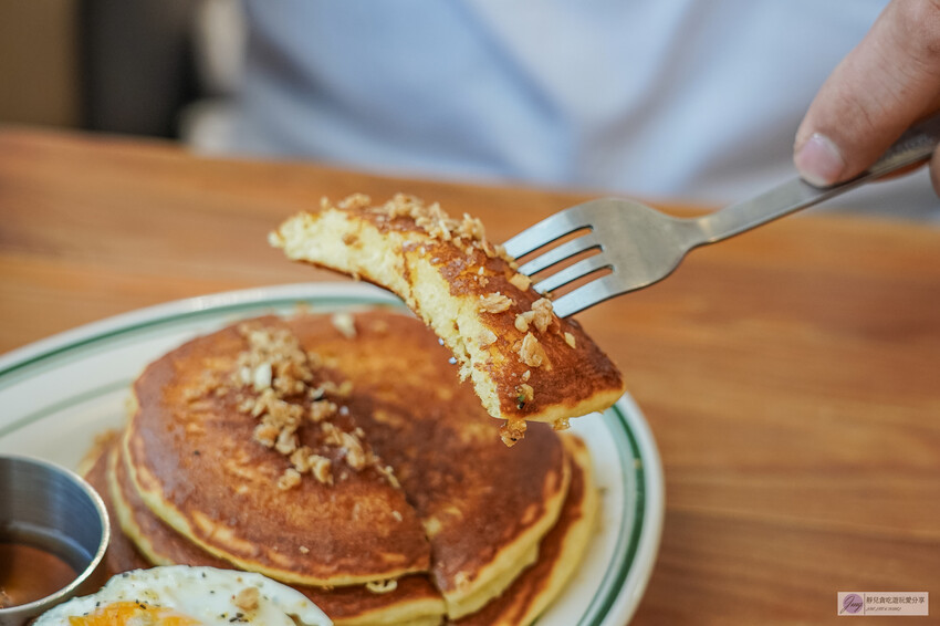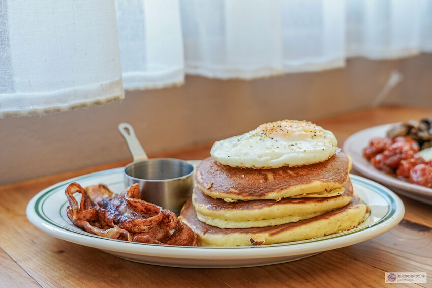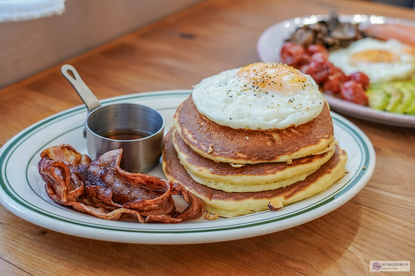 另外推薦他們的鬆餅早餐,有三片美式鬆餅,搭配培根和太陽蛋。鬆餅微甜,配上鹹鹹的培根和戳破後的太陽蛋,甜鹹交織,口感豐富。