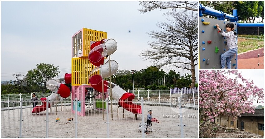 台中新社|山城首座6.3米高櫻花主題溜滑梯開放使用,櫻花特色共融遊戲場,櫻花季賞花最佳去處|新社復盛公園