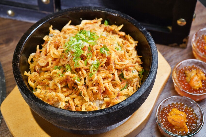 石鍋飯在上桌時會由服務人員在桌邊拌炒,馬上就能聞到櫻花蝦的鮮香,最厲害的是熟度控制地剛剛好,底下還能吃到香脆的鍋巴喲!