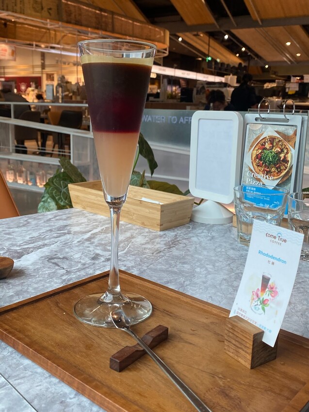 上層杯中是以玫瑰花茶&荔枝&義式濃縮咖啡&玫瑰奶霜