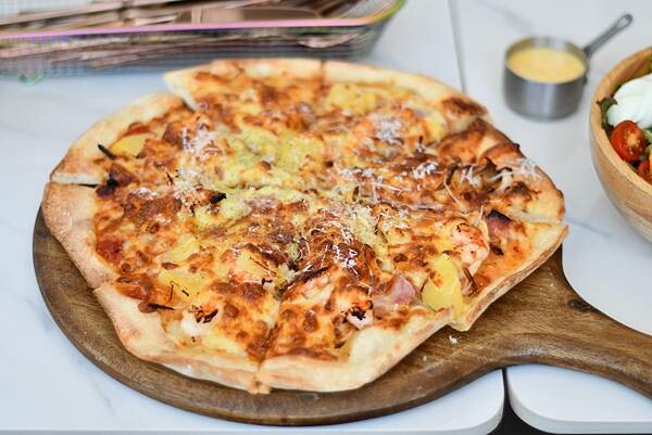 熱帶夏威夷風味PIZZA,份量還蠻大的,使用關廟鳳梨、白蝦及台灣火腿為原料,外酥內Q,薄脆好吃!