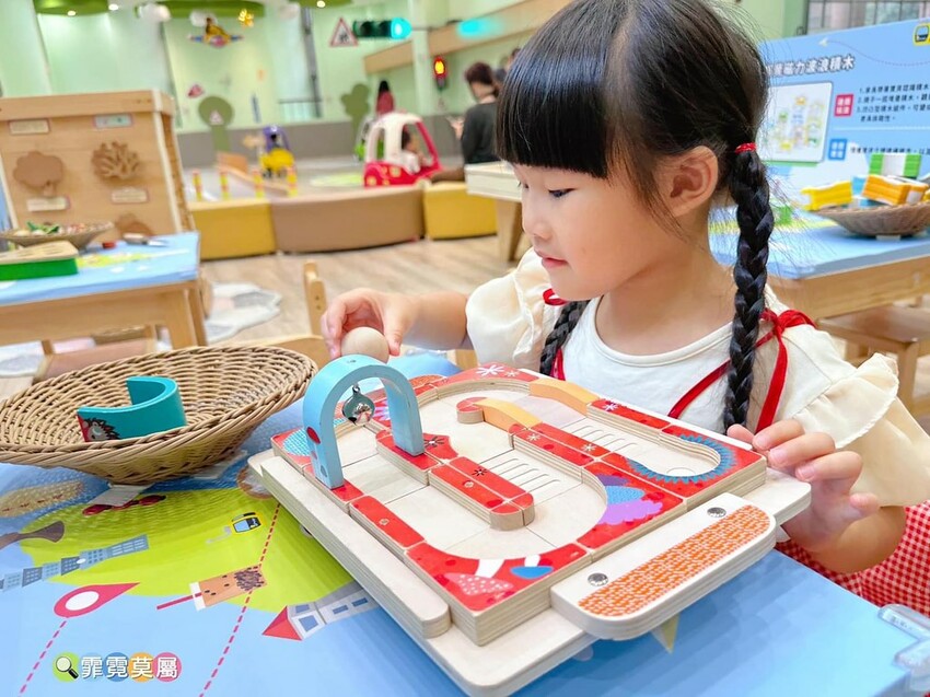 有樂高積木、磁鐵拼貼以及許多木質操作的遊具可以玩,這區學習教具選擇非常多,像是手眼協調、益智思考和創造力等,霓霓每樣都覺得很有趣全部都玩了一輪