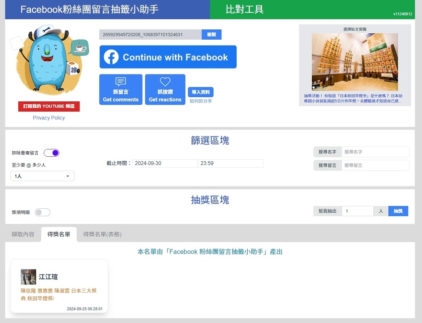 抽獎活動參加抽獎期間:2024/09/24~2024/09/30獎項:1位-秋田小禮物。參加辦法:請於 秋田民俗藝能傳承館 抽獎活動 FB貼文 1.【按讚】+ 2.【Tag 1位好友】+ 3.【留言回答 隨便說出一個日本東北三大祭典】+ 4.【公開分享】,完成上面4點,即可參加抽獎。※將於2024/10/01抽出得獎人,公告於 秋田民俗藝能傳承館 抽獎活動 FB貼文留言處及此文末。得獎人請於6日內私訊小佳粉絲團,逾期視同放棄 (隔週重抽)。【注意事項】為避免抽獎糾紛,小佳保留活動最終解釋權。