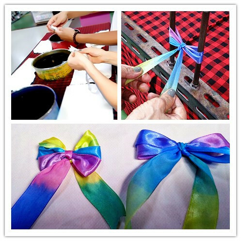白色胚帶分別放進紅黃藍3個染缸中,大約3秒鐘拿起,用布擦乾即成。