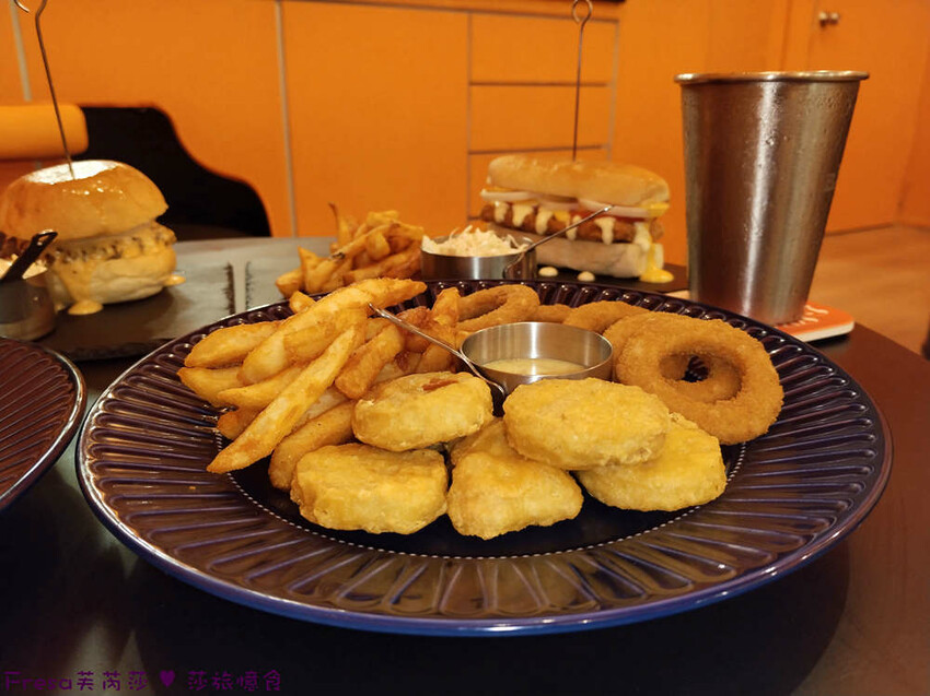 薯條、洋蔥、雞塊,搭配薯條醬.