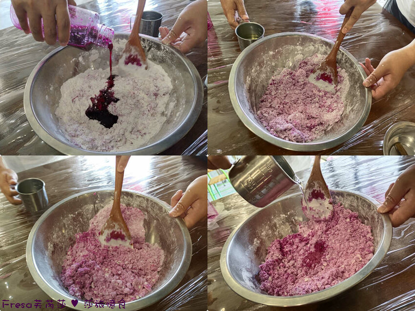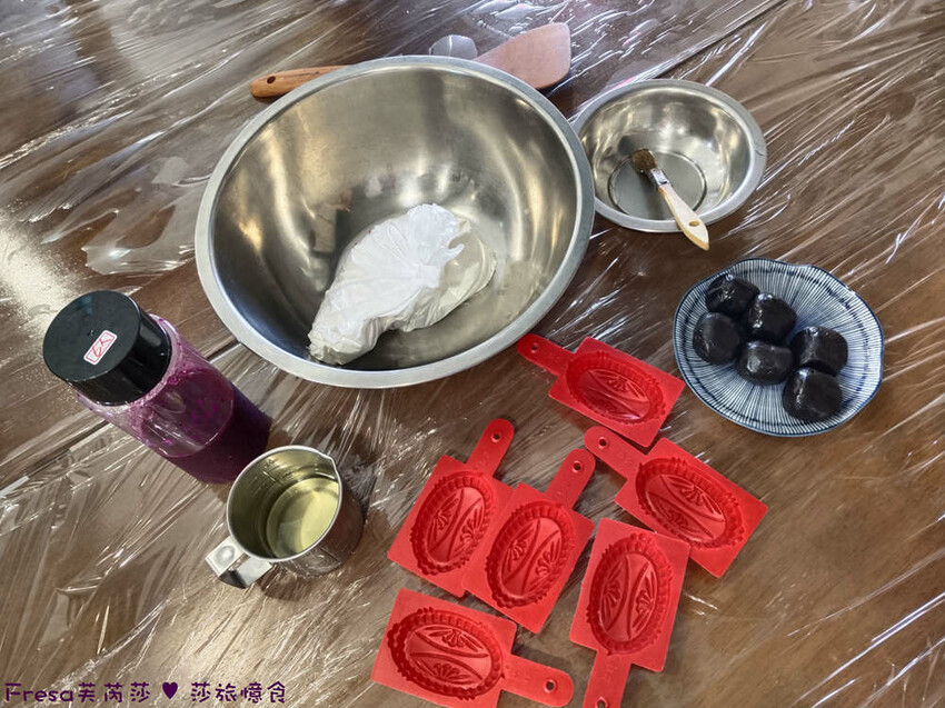 來做手工紅豆紅龜粿,全組一起合力揉成麵團,均分麵團,一個個包入紅豆餡,放上模具壓平倒出,可愛的紅龜粿就完成.