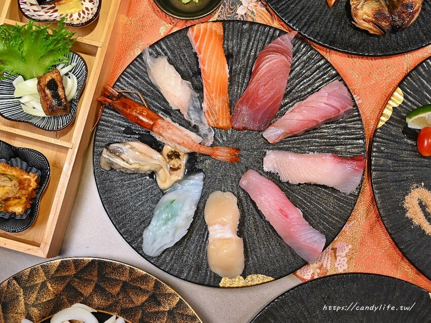 想要一次吃到多種握壽司,糖糖還蠻推薦耕壽司的特上十貫握壽司,漁貨依當天為主,糖糖今天吃到的有黃鰭鮪魚、紅甘、鰤魚、飛虎魚、北海道干貝、北海道紋甲花枝、北海道生蠔、宜蘭大溪胭脂蝦、日本真鯛及挪威鮭魚等握壽司,食材都非常新鮮,其中糖糖最愛北海道生蠔,肉質肥美又大顆