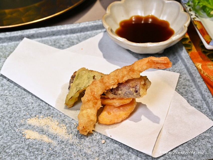裡頭包含炸蝦、炸地瓜、炸茄子、炸青椒,一旁搭配薑末、清酒熬煮的天婦羅醬汁,可加入蘿蔔泥增添香氣,另外還可以佐上些許的海老松露鹽享用風味更加有層次感