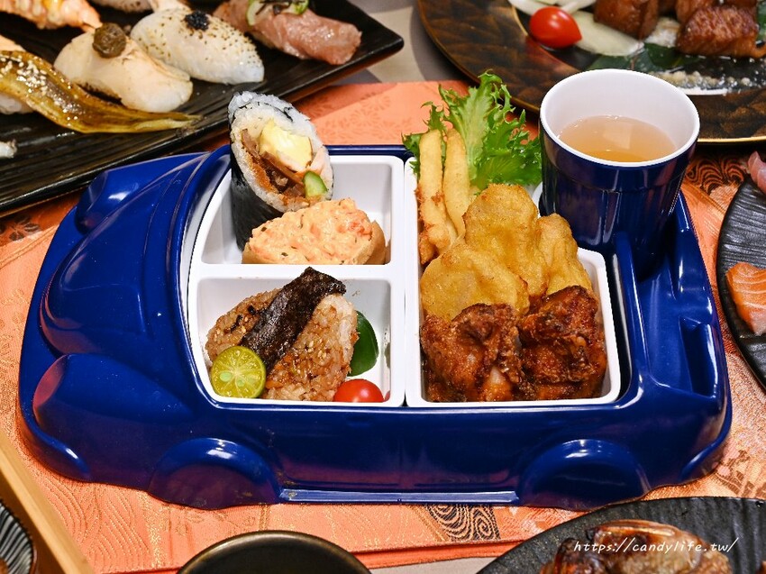 另外12歲以下的朋友,台中耕壽司還有準備兒童套餐,一套是399元,以可愛的汽車擺盤,裡頭有各式各樣的炸物,還有手卷、飯糰及龍蝦沙拉豆皮壽司,另外一個兒童套餐是香濃唐揚雞咖哩飯,裡頭的白飯還是可愛的兔兔造型呢