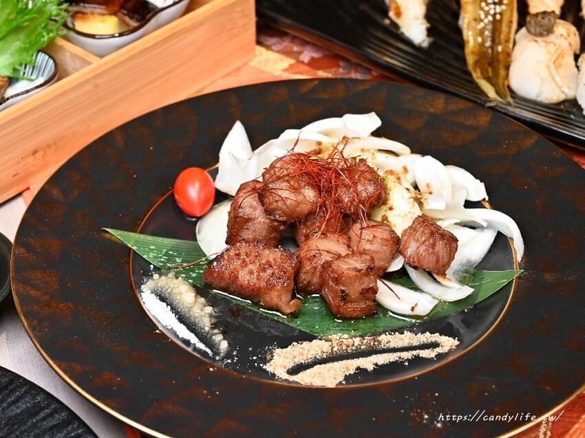 無菜單料理中的炙燒握壽司裡頭包含比目魚鰭邊肉握壽司、桐德豬里肌握壽司佐柚香蔥鹽及A5和牛肋眼握壽司,一次滿足海陸饗宴