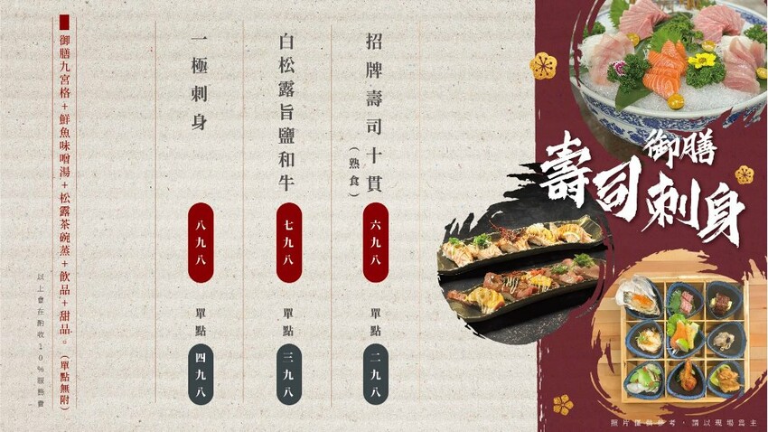 招牌壽司十貫 (熟食) 單點 298元/套餐 698元
