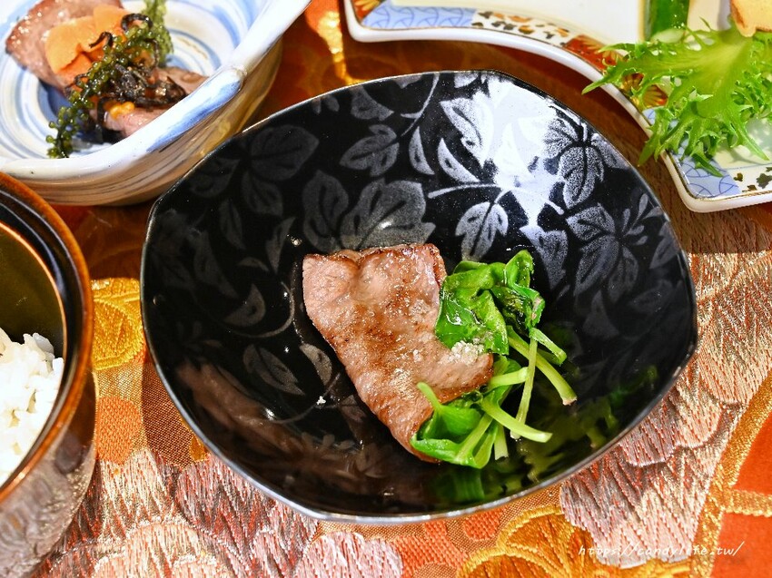 和牛第三吃是壽喜燒,以和牛本身的油脂加入蔥段、洋蔥及醬汁下去收汁,讓油脂豐富的和牛多了壽喜燒的鹹甜香氣,搭配月見蛋超讚