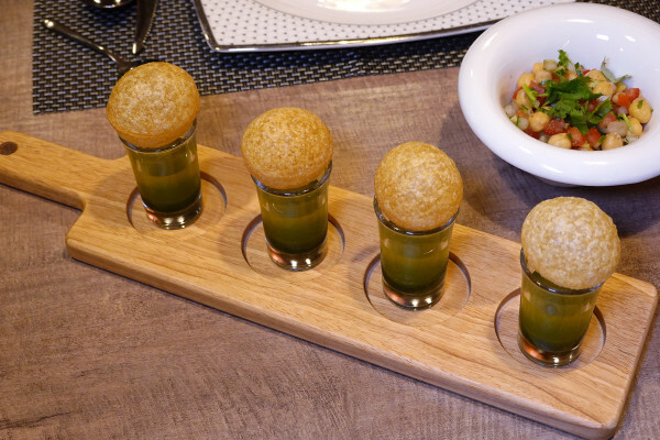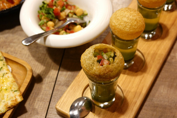 印度每一個地方喜歡的口味不同、印度脆球的內餡也都不一樣,沙拉的部份印度南部比較喜歡加優格,西部的話則喜歡加馬鈴薯,老闆印度東部的家鄉會用蠻有營養的鷹嘴豆,所以這碗沙拉有放了鷹嘴豆、番茄、洋蔥、黃瓜,還加了檸檬汁及很多的香料去調製。