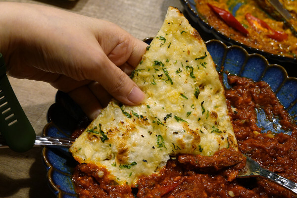除了單吃之外也很建議撕下一小塊來蘸咖哩,香脆又不失柔軟的烤餅不僅提升了咖哩的風味,咖哩也讓烤餅的香氣變得更加迷人!