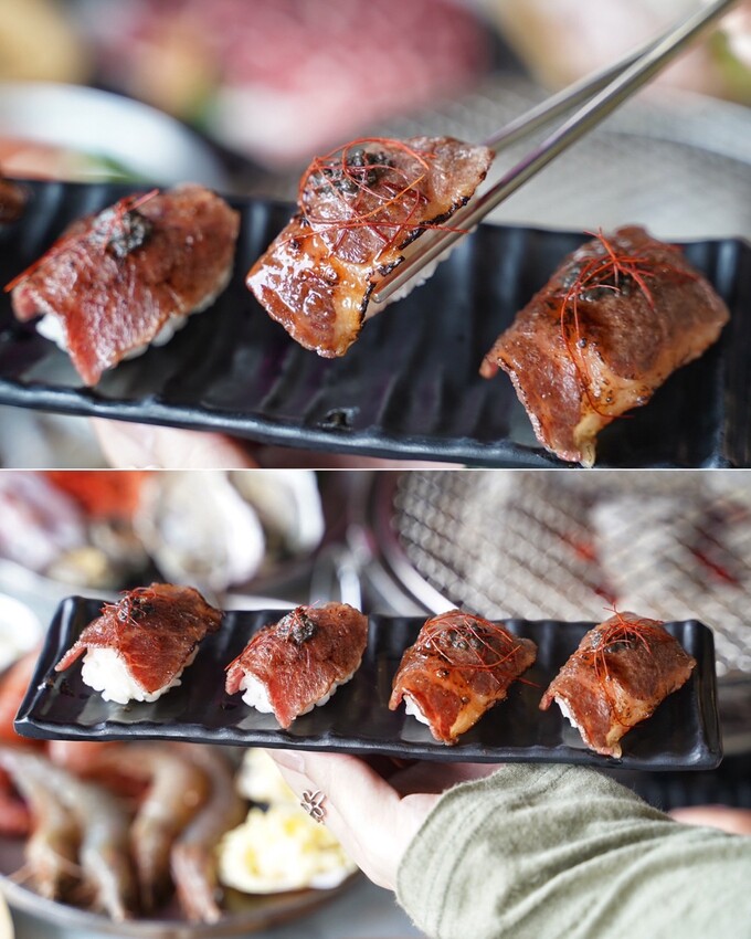開烤之前先來份「炙燒松露和牛壽司」墊墊胃!和牛炙燒後逼出油脂,油亮的表皮,香氣更迷人,再加上黑松露及日式醬料,這個來個10貫肯定沒問題!